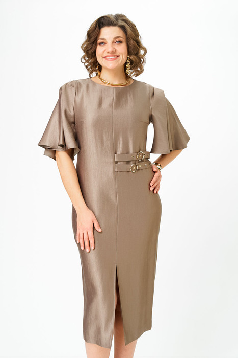 Платье прилегающего силуэта. Горловина круглая, по центру переда шов, по низу шва разрез, с левой стороны по линии талии декоративный элемент. Рукава втачные, фантазийной формы.