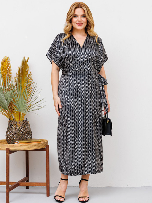 Элегантное платье на запах. Рукав цельнокроенный кимоно. Платье отрезное по линии талии. Силуэт платья - прямой, Оно выполнено из плотного атласа, благодаря чему, оно красиво струится и развивается при хотьбе. Длина платья - 132 см.