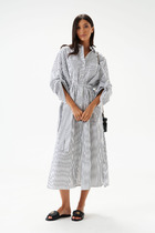 Платье шифоновое А-образного силуэта. Рукав длинный вверху и внизу на резинке. Горловина обработана планкой с резинкой. На талии кулиса с завязками по бокам. Платье на подкладке.