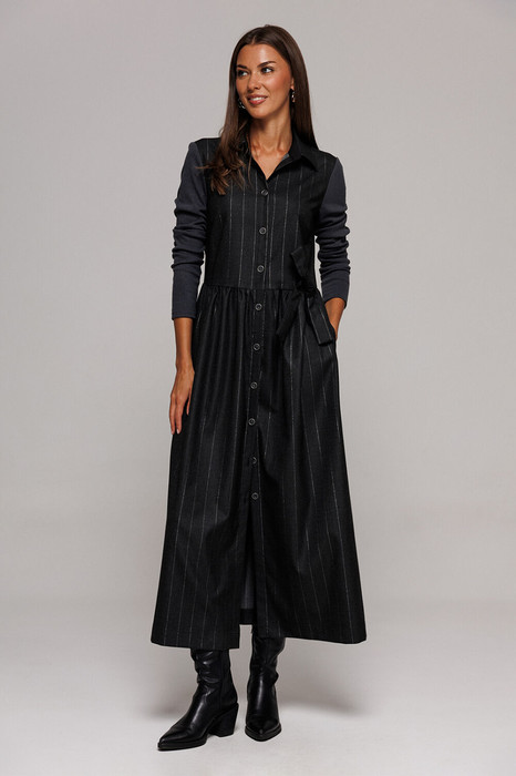 Платье длинное из костюмной ткани в полоску из люрекса с втачным длинным одношовным трикотажным рукавом. Полочка с центральной застежкой на петли пуговицы и с нагрудными вытачками. По спинке нашивка "BUTER". Платье отрезное по линии талии и со сборкой по шву притачивания низа. Воротник рубашечный отложной на стойке. По линии талии бант из основной ткани. Платье без подкладки.
