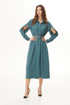 Платье шифоновое А-силуэта. Втачной длинный рукав со сборкой по окату и внизу на завязке. Полочка и спинка с притачными слегка присборенным воланом с рюшей. Воротник стойка-рюша и вырезом каплей по переду на завязке. Платье на подкладке.