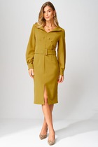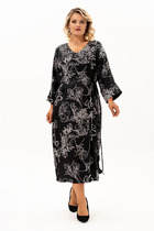 Платье шифоновое А-силуэта, отрезное по линии талии с рюшей. Втачной длинный рукав со сборкой по окату и внизу на резинке. По переду лиф с центральной застежкой на петли-пуговицы. Полочка и спинка с притачными, слегка присборенным воланом с рюшей из основной ткани и воланом из отделочной ткани по низу платья. Воротник-стойка с рюшей. Платье на подкладке.