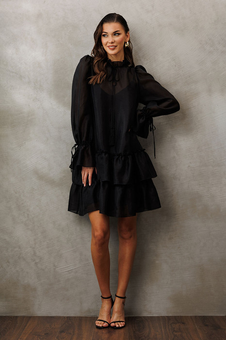 Платье из креп-шифона с напылением А-силуэта, состоящее из 2-х слоев. Верхний слой: Втачной длинный рукав со сборкой по окату и внизу на завязке, полочка и спинка с притачными слегка присборенным воланом с рюшей,в оротник стойка-рюша и вырезом каплей по переду на завязке. Нижний слой: платье на бретелях.