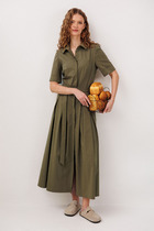 Платье длинное с втачным коротким рукавом до локтя, визу на притачной манжете. Полочка с центральной застежкой на петли-пуговицы по притачной потайной планке, с карманами в боковых швах. Платье отрезное по линии талии, лиф с талиевой вытачкой, юбка со встречными складками от талии. Спинка с кокеткой и нашивкой на кокетке. Воротник рубашечный отложной на стойке. Платье без подкладки. Съемный пояс из основной ткани на полукольцах.