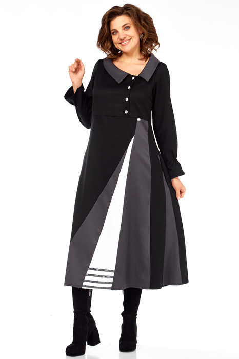Это платье-ода элегантности движения и архитектурной точности, где каждый элемент продуман до мелочей. Асимметричные диагональные линии и расклешенный подол визуально вытягивают фигуру, делая ее стройнее и изящнее. Вы будете чувствовать себя уверенно и грациозно. Контраст черного, серого и белого создает графический, но не резкий образ, ассиметричные линии и "разрез" на юбке придают платью динамику, словно оно находится в постоянном, но контролируемом движении. Широкий воротник и декоративные пуговицы напоминают о винтажных патьях и шинелях, добавляя нотку ретро-шика и благородства. Забудьте о скучных нарядах! Это платье — произведение искусства, где каждая линия и каждый цвет продуманы, Вы будете ловить восхищенные взгляды, куда бы ни пошли. Техническое описание: Платье миди сложного асимметричного кроя, силуэт полуприлегающий в верхней части, переходящий в расклешенный А-силуэт к низу, создающий эффект удлиненной и струящейся фигуры. Воротник широкий, плоский, отложной, с закругленными краями, выполненный из темно-серой ткани, что придает ему элегантность и слегка винтажный акцент. Лиф приталенный, с застежкой на петли пуговицы. Декоративный ряд контрастных пуговиц, расположенных асимметрично, подчеркивает V-образный вырез и утончает силуэт. Рукава длинные, втачные, с легкой сборкой на манжетах, что добавляет мягкости и женственности. Основная часть низа выполнена из плотной черной ткани. Главная изюминка — асимметричный крой с вертикальными контрастными вставками, создающими эффект интригующего запаха или разреза. Контрастные вставки из черного основания юбки вырываются две широкие клиновидные вставки: одна темно-серая, другая — ярко-белая. Они расположены диагонально, пересекаясь, и создают визуальную игру. Белая вставка имеет выраженный декор в нижней части — три горизонтальные кружевные полоски, что добавляет графичности и уникальности. Спинка цельнокроеная с двумя выточками для лучшего прилегания фигуры, выполнена из основной черной ткани, подчеркивая стройность силуэта. Длина спинки 125 см, длина рукава 6 см.