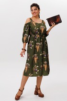 Платье женское свободного покроя из хлопковой ткани. Вырез горловины оформлен воротником рубашечного типа. Застежка- планка с потайными пуговицами. Рукава- реглан, переходящий в кокетки. На спинке- небольшая сборка в области лопаток. Имеются карманы в боковых швах. Спереди и сзади выполнены декоративные элементы в виде кулисы со шнурками. При их помощи можно регулировать объем талии и создавать приталенный силуэт. В боковых швах имеются разрезы.