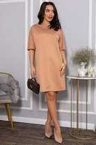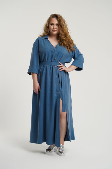 Платье женское А-силуэта. Воротник отложной, вырез V-образный, застежка смещенная однобортная на кнопки. Рукав втачной с спущенной линией плеча, по низу манжет. В боковых швах функциональные карманы. Изделие дополнено съемным поясом из основной ткани.