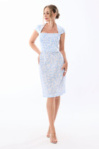 Платье женское прилегающего силуэта из трикотажного полотна. Вырез горловины оформлен воротником рубашечного типа. Застежка - молния. Рукава - реглан со сложными архитектурными формами. Приталивание достигается фигурными рельефами.