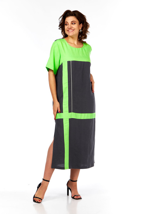 Платье женское полуприлегающего силуэта со спущеннгой линией плеча. По переду кокетка. Настрочены отделочные детали и тесьма. По спинке средний шов. По боковым швам разрезы. Рукав втачной одношовный,короткий. В боковых швах обработаны карманы. Используется два вида ткани.
