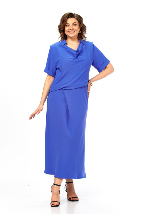 Платье женское длиной до середины икры, слегка расклешенное к низу. Спинка с косым передом в области талии и средним швом до разреза. Перед с косым подрезом в области талии, образующий мягкую складку  из лифа и 1 глубокую складку от подреза вниз. Горловина с рубашечным воротником на стойке и драпировкой в виде качели. Рукав втачной с отложными манжетами.