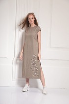 Платье женское из джинсовой ткани полуприлегающего силуэта дополненное отлетным поясом из основной ткани. Рукав длинный с притачной манжетой на петлю и пуговицу. По спинке обработана кокетка и бантовая складка по шву притачивания спинки к кокетке. По полочке обработаны накладные карманы с клапаном, на уровне линии груди и на уровне чуть ниже линии тали, на верхних клапанах две косые петли контрастного цвета, на нижних одна петля контрастного цвета. Воротник пиджачного типа, застежка центральна на петли и пуговицы. Платье отстрочено отделочными контрастными нитками.