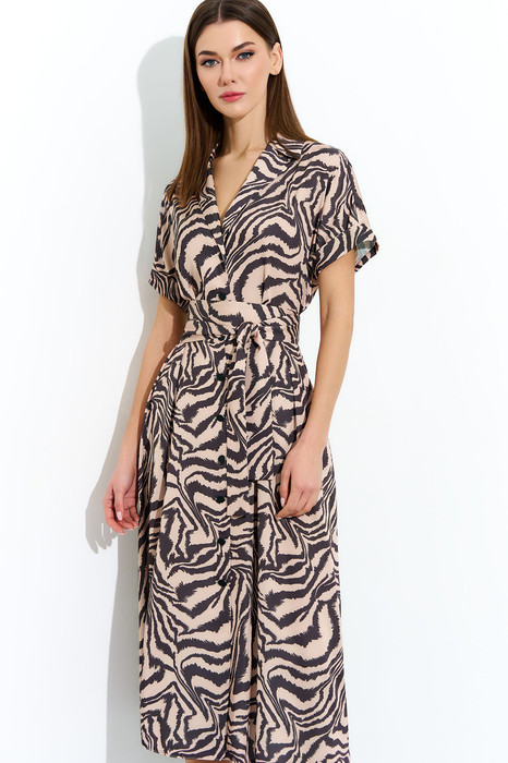 Платье женское, полуприлегающего силуэта, отрезное по линии талии, шов присобранный на резинку. по нижнему срезу лифа переда и спинки заложены складки.. Юбка, расширенная к низу. По верхнему срезу юбки заложены складки.Боковой карман "хулиган "Воротник втачной, изподборта сформирован лацкан застежка на прорезные петли и пуговицы. Талию украшает пояс.