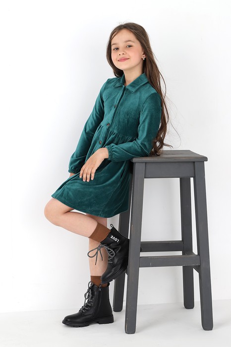 Актуальное платье для девочки, из трикотажного вельвета. Модель с застёжкой на пуговицы, с отложным воротником, отрезной "юбкой" на сборке, карманами в боковых швах. Рукава по низу собраны на эластичную тесьму. Отличный выбор для девочек разных возрастов.