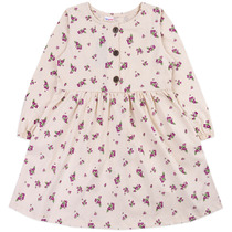 Платье из легкой хлопковой ткани, слегка приталенного силуэта, расклешенное книзу. Рукав втачной, длинный, на манжете из отделочной ткани, в верхней части манжета рукав подогнут с наплывом. Горловина отделана обтачкой из эластичной ткани. Полочка украшена шелкографией. Ткань хорошо пропускает воздух.