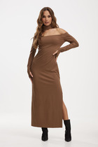 Платье выполнено из трикотажного полотна в рубчик. Платье приталенного силуэта, отрезное по линии талии, длиной миди, со съемной верхней частью (кроп-топ). Перед и спинка цельные. Плечевой шов зауженный в виде широкой бретели. Рукав кроп-топа втачной, одношовный, с прорезью по низу для пальца.