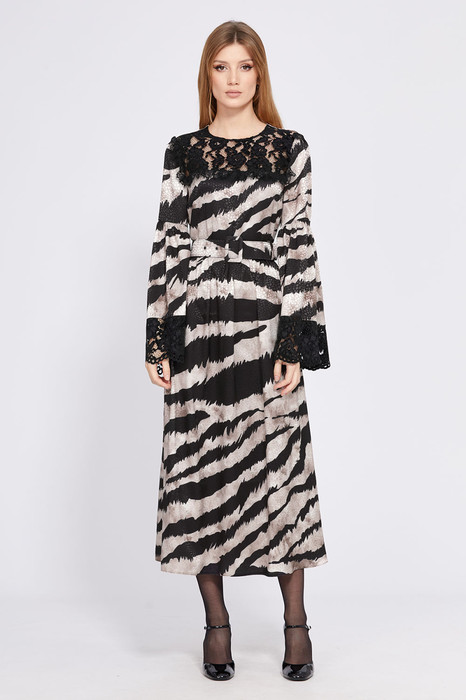 Платье выполнено из жаккардового атласа с принтом. Платье Х-образного силуэта, отрезное по линии талии, длиной миди. Спереди лифа кокетка из гипюра с рюшей. Застежка на потайную молнию в среднем шве спинки. Горловина округлой формы. Рукав втачной, расширенный к низу. Низ рукава на притачной манжете из гипюра. Юбка расширена к низу. Платье на отлетной по низу подкладке. В боковых швах карманы. В комплект входит съемный ремень с обтяжной пряжкой.