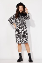 Платье выполнено из трикотажного полотна. Платье приталенного силуэта, отрезное по линии талии, длиной выше линии колена. Спереди вытачки для прилегания цельнокроеной стойки и средний шов с застежкой на потайную молнию. Рукав втачной, двухшовный с локтевой вытачкой. В переднем шве рукав с потайной молнией.