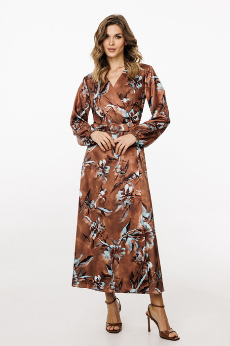 Платье выполнено из атласа с принтом. Платье Х-образного силуэта, отрезное по линии талии, длиной миди. Перед выполнен "на запах" со складками по линии талии. Спинка цельная. Вырез V-образной формы. Рукав втачной, одношовный, с напуском. Низ рукава собран на эластичной тесьме. Юбка расширена к низу. Платье на отлетной по низу атласной подкладке. В комплект входит съемный ремень с обтяжной пряжкой.
