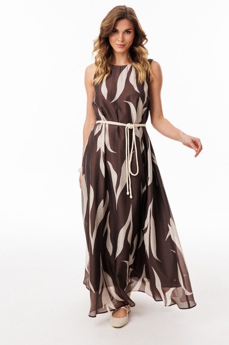 Платье выполнено из плательно-блузочной ткани. Платье А-образного силуэта, длиной миди. Горловина переда округлой формы, горловина спинки с V-образным вырезом, завязывающимся на тесьму из основной ткани. Платье на отлетной по низу подкладке.