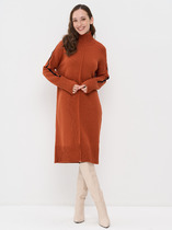 Платье женское приталенного кроя выполнено из тканей-компаньонов. По полочке платья расположена декоративная кокетка с молнией. Застежка разъемная молния по переду. Рукав-втачной длинный с патой. Горловина-стойка.