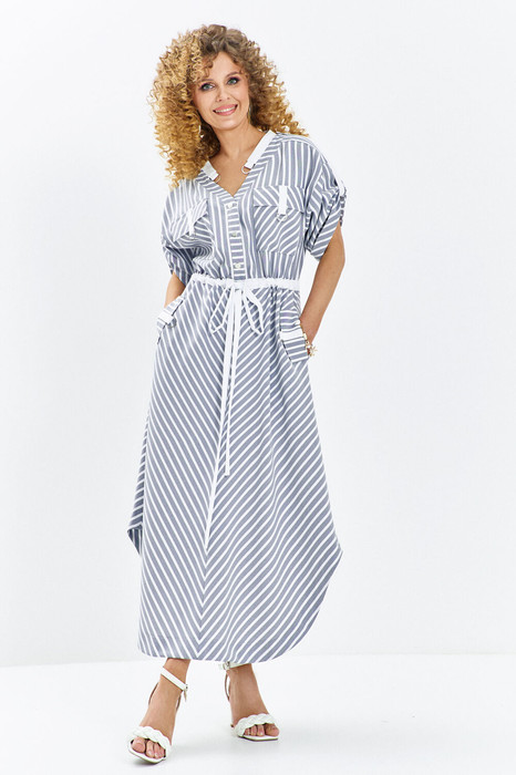 Платье женское выполнено из льна вишера, изделие отрезное по линии талии. Лиф изделия с v-образной горловиной и накладными карманами с клапаном, рукав втачной, приспущенный. На плечах платья расположены паты. По переду изделия планка с застежкой петля-пуговица. Юбка изделия разрезная по центру с совмещенной полоской. В боковых швах имеются функциональные карманы с клапаном. По талии расположена кулиса с поясом-завязкой. Низ изделия фигурный.Принт: Классическая тонкая полоска (диагональная и вертикальная), создающая интересный геометрический эффект.