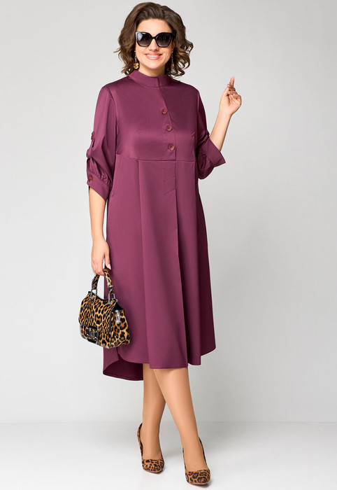 Платье женское повседневное полуприлегающего силуэта с фигурным низом расширенное к низу, выполнено из плательной ткани. Вырез горловины воротник «стойка», рукав втачной 7/8 по низу на притачной манжете собран на сборку. В рукаве отделочная пата которой можно регулировать длину рукава и делать короче. В боковых швах обработаны карманы и разрезы . По переду застежка до талии на обметанные петли и три отделочных пуговицы, по спинке фигурная кокетка и встречная складка. Платье расширено к низу за счет складок по переду. Декором служит отделочная нашивка по спинке и декоративные пуговицы по переду и рукавам.
