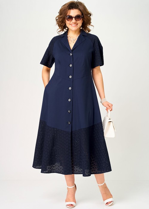 Платье женское стильное нарядное повседневное выполнено из хорошего красивого хлопка в сочетании с шитьем. Вырез горловины отложной воротник, застежка доверху на обметанные петли и пуговицы. Рукав реглан из отделочной ткани (шитье), по центру рукава обработан разрез. Платье отрезное по талии, подрез фигурный по полочке и спинке, придает модели элегантный приталенный вид. Волан по низу платья из отделоной ткани (шитье). Декором служат отделочные пуговицы.