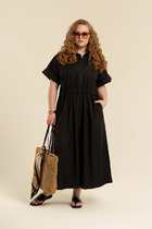 Платье женское нарядно-повседневное полуприлегающего силуэта до талии и расширенное к низу. Платье отрезное по линии талии, вырез горловины V-образный с ассиметричными рюшами из тканей двух дизайнов. Проймы обработаны обтчками. В боковых швах плать обработаны карманы, по низу притавчной волан из отделоной ткани(шитье). декором служит пояс из основной ткани.