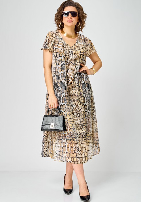 Платье женское легкое красивое стильное нарядное повседневное из шифона с анималистичным принтом на подкладке свободного силуэта расширенное к низу. Вырез горловины V образный на обтачке, по горловине широкий волан переходящий в рукав. Что придает изделию легкость и элегантность. В боковых швах обработаны разрезы. Низ платья фигурный. Декором служит волан и принт самой ткани.