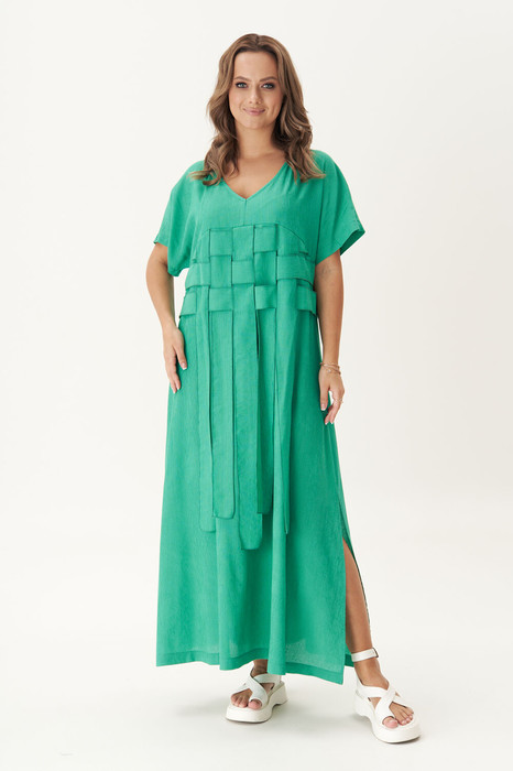 Свободное, многослойное, из натуральной вискозы с авторской декорацией из плетёных полос - это не платье ….. это мечта! Свободный А-силуэт, цельнокроеный рукав, V-образный вырез. Полочка с фигурной кокеткой и плетением из лент. Спинка с фигурной кокеткой, средним швом и повторяющим полочку плетением. По боковым швам - разрезы.