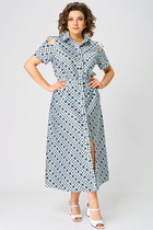 Силуэт свободный, расширенный, покрой - цельнокроенный, застёжка центральная на пуговицы. Полочки с накладными большими карманами, спинка с отрезной кокеткой, цельнокроенной с рукавом, и средним швом. По боковым швам - разрезы. Кокетка полочки и спинки из отделочной ткани. Длина платья около 105 см. Длина рукава с плечом около 40 см.