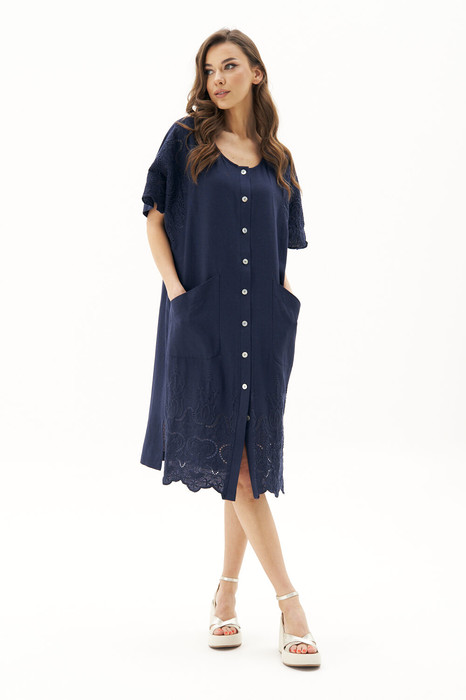 Силуэт свободный, расширенный, покрой - цельнокроенный, застёжка центральная на пуговицы. Полочки с накладными большими карманами, спинка с отрезной кокеткой, цельнокроенной с рукавом, и средним швом. По боковым швам - разрезы. Кокетка полочки и спинки из отделочной ткани. Длина платья около 105 см. Длина рукава с плечом около 40 см.