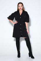 Верхнее платье А-силуэта, отрезное по линии талии на полочке, с мягкой складкой и эффектными разрезами по центру переда и боковым швам. Рукав втачной, на притачной манжете со сборкой в нижней части.