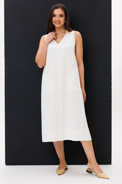 Свободный А-силуэт, английская пройма, V-образный вырез, воротник, фигурная линия низа. Полочка с центральным швом, боковыми рельефами с фигурными карманами.
