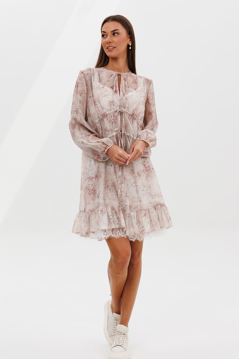 Свободный А-силуэт, втачной покрой. Полочка с ценральным швом и диагональными кулисами с завязками. Рукав со сборкой по линии низа. Спинка с отрезной кокеткой. Нижняя часть спинки со сборкой по центру. По низу платья притачной волан со сборкой. Подкладка платья из х/б батиста, на регулируемых бретелях, с притачным воланом с кружевом.