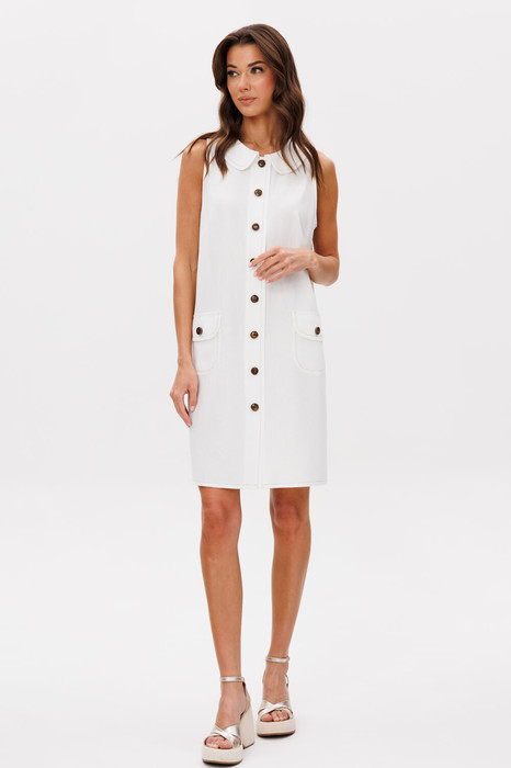 Стиль минимализм уже несколько сезонов на пике модных трендов, как продолжение эстетики 60-х. Лаконичное платье А-силуэта, выполненное из натурального льняного полотна с вискозой, нейтрального белого цвета с контрастными широкими строчками и пуговицами. Минимализм деталей, ничего лишнего, трендовая длина мини. Легкий А-силуэт, английская пройма, круглый воротник и центральная застежка. Полочки с нагрудной вытачкой и накладным карманом с клапаном. Спинка со средним швом и отделочной эмблемой-нашивкой.