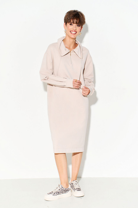 Стильное женское платье полуприлегающего силуэта выполнено из мягкого трикотажа футер 2-х нитка класс "пенье". Рукава со спущенной линией плеча и манжетой с небольшими мягкими складками; высокий воротник и застёжка-молния по переду. Изделие  полностью соответсвтует заявленному размеру. Пожалуйста, пользуйтесь таблицей обмеров готового изделия.