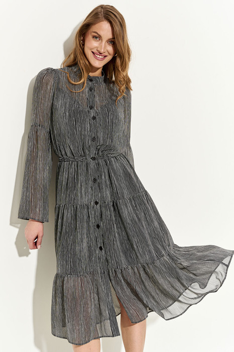 Платье женское полуприлегающего силуэта из шифона на подкладке. Перед платья с нагрудными вытачками; по линии талии вставлена резинка; юбка изделия украшена тремя воланами с небольшой сборкой; рукава втачные с аккуратной сборкой по окату и по отрезной части рукава. Верхняя часть платья имеет подкладку в виде топа на регулируемых бретелях, что обеспечивает комфортную посадку; нижняя часть подкладки - отлетная. Застежка-планка на петли и пуговицы. Платье полностью соответствует заявленному размеру. Пожалуйста, пользуйтесь таблицей замеров готового изделия, чтобы подобрать идеальный размер.