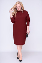 Платье женское А- образного силуэта выполнено из трикотажного крепа с мелким блеском. По переду платья расположены пять отделочных защипов, которую зрительно вытягивают фигуру. Рукав втачной одношовный, низ которого оформлен манжетой с пуговицами и сеточкой. Спинка со средним швом и потайной молнией вверху. Отделкой платья служит декоравная брошь.