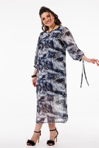 Платье женское полуприлегающего силуэта из трикотажной ткани двух цветов.Спинка со средним швом заканчивающаяся разрезом.Горловина круглая. Рукава гладкие с имитацией планки. На планке пришиты декоративные пуговицы.