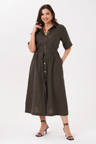 Платье женское слегка расклешённое к низу, льняное. На переде расположена декоративная печать. Нагрудная вытачка идёт с боковых швов. На правой половине расположен накладной карман. Спинка со средним швом, в котором расположена застёжка горловины на одну пуговицу. Горловина круглой формы. По боковым швам имеются разрезы. Рукава короткие, одношовные.