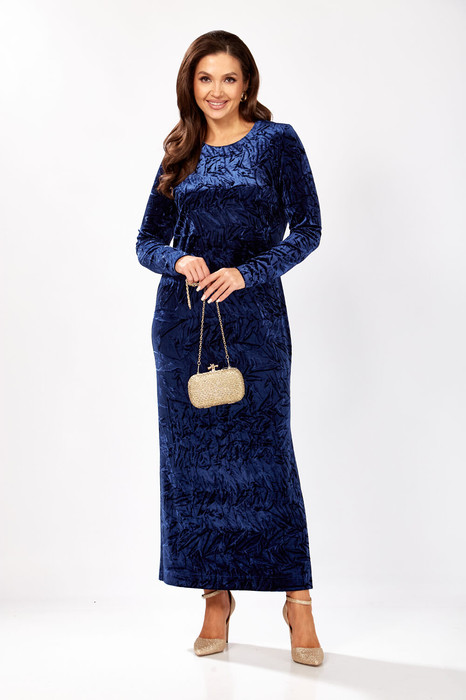 Платье прямого силуэта из бархата. В боковом шве разрез. Рукав втачной одношовный. По спинке застежка капелька на петлю и пуговицу. Длина платья - 136 см, длина рукава - 66 см.