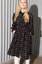 Платье приталенного силуэта отрезное по линии талии из мягкой вельветовой ткани. Верхняя часть переда с нагрудной вытачкой. Спинка со средним швом и потайной молнией. Рукав втачной со сборкой по окату. По  низу рукава и по низу изделия волан. Длина платья -  125 см, длина рукава - 40 см.