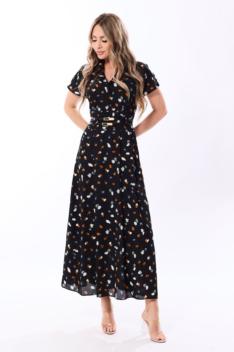 Платье c отложным воротником и лацканами, втачным широким поясом, застежкой на потайную молнию в левом боковом шве. Верхняя часть платья с кокеткой переда и спинки. Верхняя часть переда с имитацией застежки, односторонними складками по шву притачивания кокетки и пояса, верхняя часть спинки с односторонними складками по шву притачивания пояса. На втачном поясе расположены шлевки для двух съемных поясов. Нижняя часть переда и спинки с четырьмя односторонними складками по шву притачивания пояса. Платье без рукавов , со спущенным плечом. На кокетке платья расположена декоративная пата, закрепленная по плечу тремя пуговицами. Платье со съемными поясами.