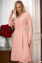 Платье без воротника , с V-образным вырезом горловины. Платье отрезное по линии талии. Полочки лифа переда располагаются на запах, с цельнокроенными завязками. Лиф спинки с талиевыми вытачками. Нижняя часть переда не закреплена к лифу, с центральной застежкой на петли и пуговицы. Шов по талии со стороны спинки присборен на резинку. Рукав втачной, короткий, с отрезной манжетой. Окат и шов притачивания манжеты присборен.