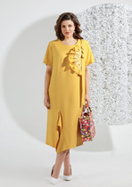 Платье расширенного к низу силуэта, без воротника, без рукавов, с круглым вырезом горловины. Горловина и проймы окантованы. По переду с отрезной кокеткой. Нижняя часть переда по шву притачивания к кокетке присборена. Спинка с отрезной кокеткой фигурной формы. Нижняя часть спинки по шву притачивания к кокетке присборена.