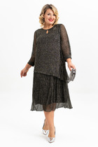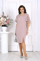 Платье, с центральной двубортной застежкой на пришивные кнопки, с отложным воротником и лацканами. Верхняя часть переда с нагрудными вытачками. Верхняя часть спинки со средним швом и талиевыми вытачками .Нижняя часть переда и спинки расклешенная. Низ переда закладывается в односторонние складки. Шов по талии присборен на резинку. Рукав втачной, короткий, с отложной манжетой. Платье со съемным поясом.