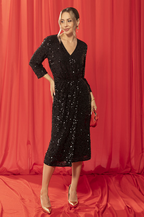 Платье полуприлегающего силуэта, без воротника с V-образным вырезом горловины, с полочками на запах, зафиксированными по линии талии и с застежкой на пришивную кнопку по горловине. Платье отрезное по линии талии По линии талии полочки присборены, также шов по талии присборен на резинку. Рукав втачной, 3/4.