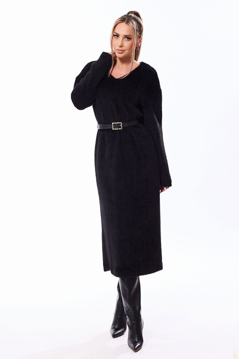 Платье беззастежки, без воротника, с V-образным вырезом горловины. Перед цельный, спинка со средним швом, заканчивающимся шлицей. Рукав втачной, длинный. Платье со съемным декоративны поясом из кожезаменителя.