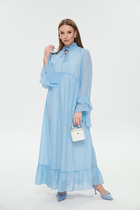 Платье с центральной застежкой на петли и пуговицы, без воротника, с V-образным вырезом горловины. По переду с нагрудными вытачками. Спинка со средним швом, талиевыми вытачками. Рукав втачной, короткий. Платье со съемным поясом.